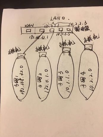 如图,路由器上的 LAN 口分别做为每个子网的网关,直接连接所有子网的交换机,比如 192.168.32.1 的网关就是 192.168.32.1,对应的也就是路由器的第一个 LAN 口,直接连接子网段的交换机;