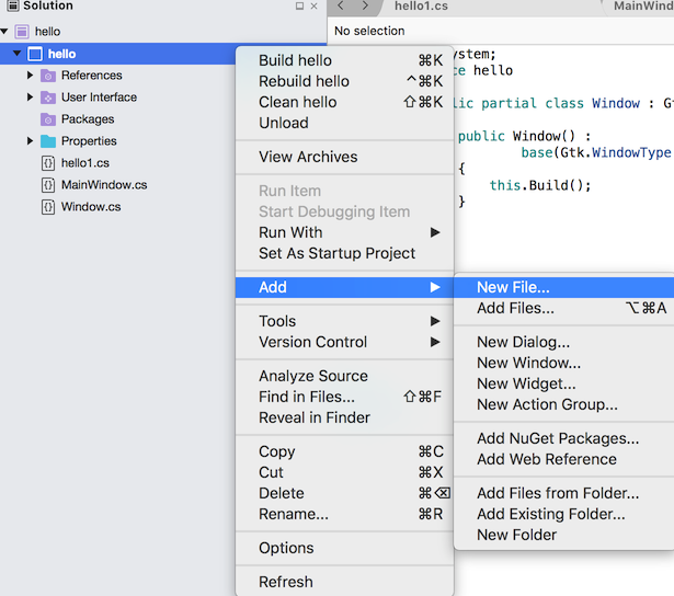 工程生成以后,会在 Location /Users/mac/workspace/mono/hello 目录中生成项目 hello;