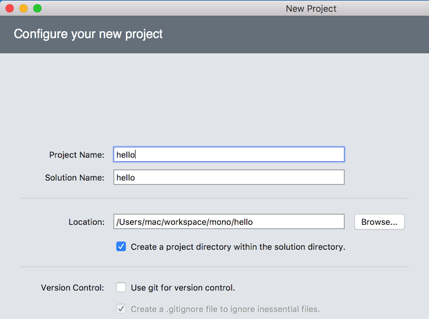 输入项目相关信息,注意,Location 我选择的是 /Users/mac/workspace/mono/hello