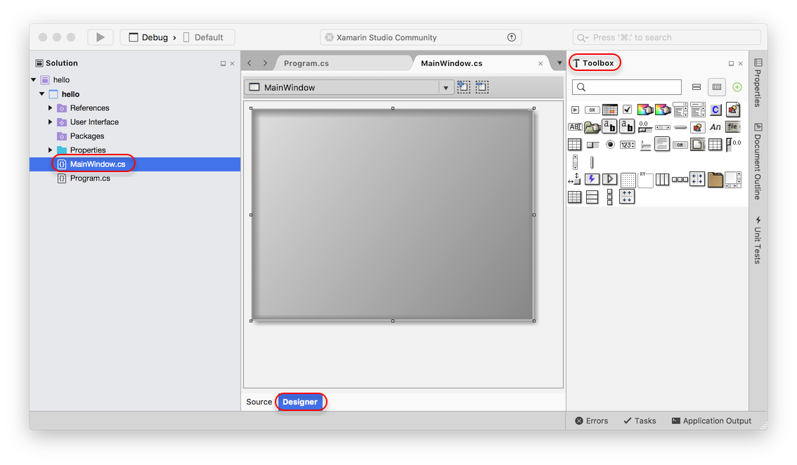 选择 MainWindow.cs,选择 Designer,使用 Toolbox 进行设计。 Xamarin Setic 教程