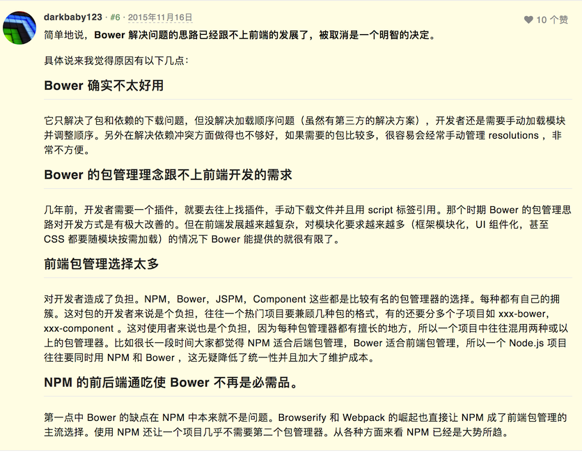 该篇文章描述了,由于 webpack 等工具的产生,使得 NPM 一个管理 NodeJs 模块的工具也完全能够胜任 Bower 的工作了,使得前端 Javascript 代码能够模块化,并且以模块化的方式进行管理。最核心的部分摘录如下,
