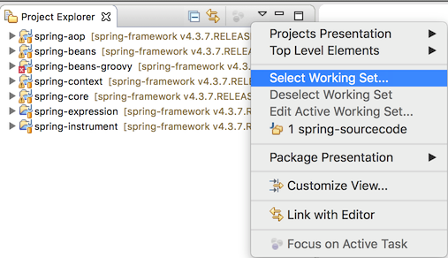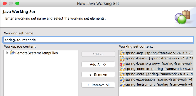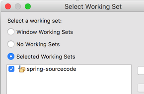 如图,建立了两个 working sets,一个 working set spring-sources
