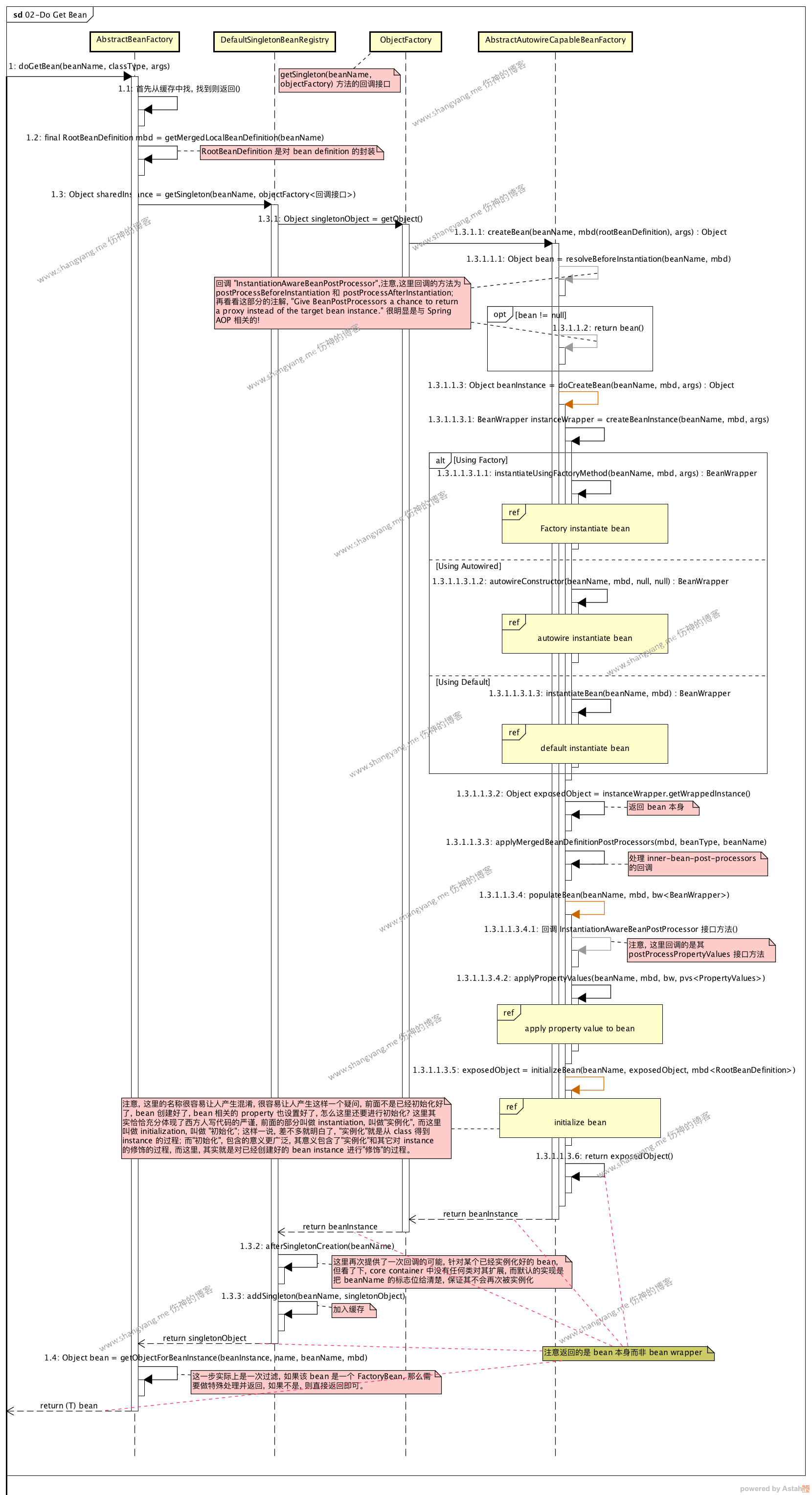 备注,这里只针对 Spring 容器实例化 singleton bean 的主流程进行介绍;singleton bean 在 Spring 容器中被初始化的特点是,在 Spring 容器的启动过程中就进行初始化;