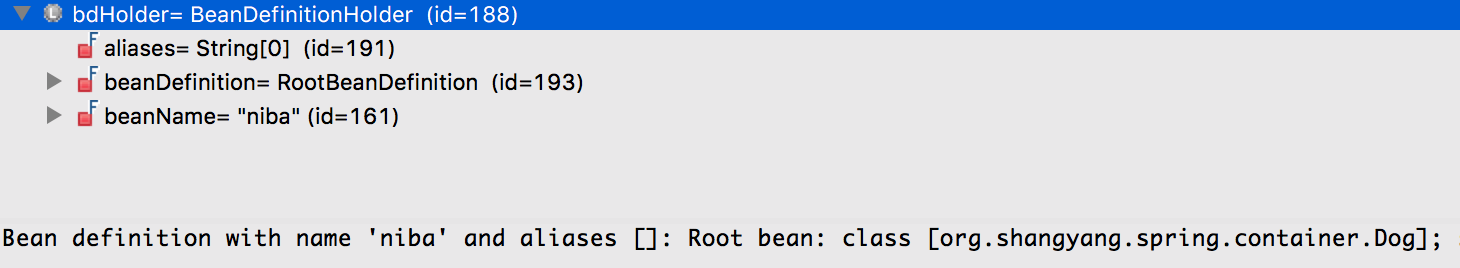 BeanDefinitionHolder,注意这里是对 candidates( ref-beans ) definitions 的包装对象,测试用例中使用到的 candidates 为 niba 和 kiba,为了加深映像,给一张 debug 截图,可见,是对 candidate 既是 target class 进行的封装;