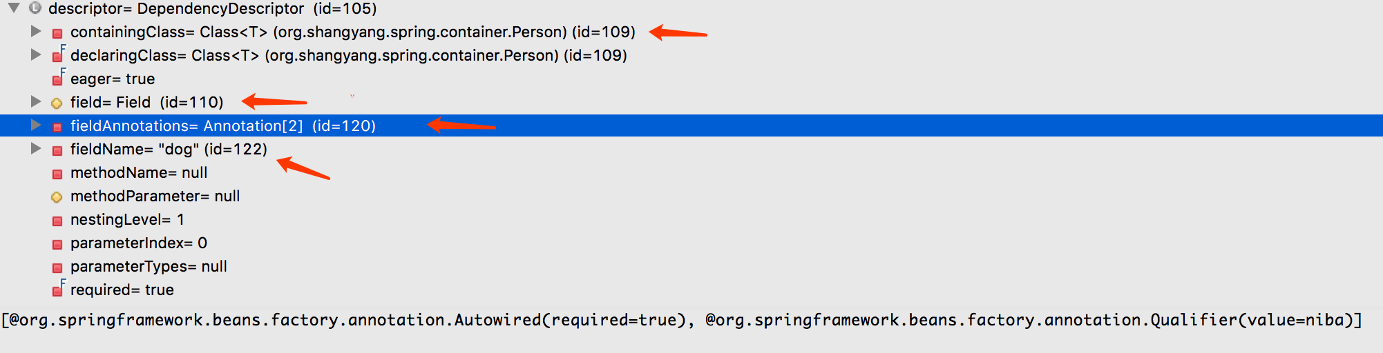 可以理解为从 niba 和 kiba 的 Class Type 中去找是否有相应的 @Qualifier 注解;若有则赋值给变量 qualifier,涉及的代码从 13-53 行根据