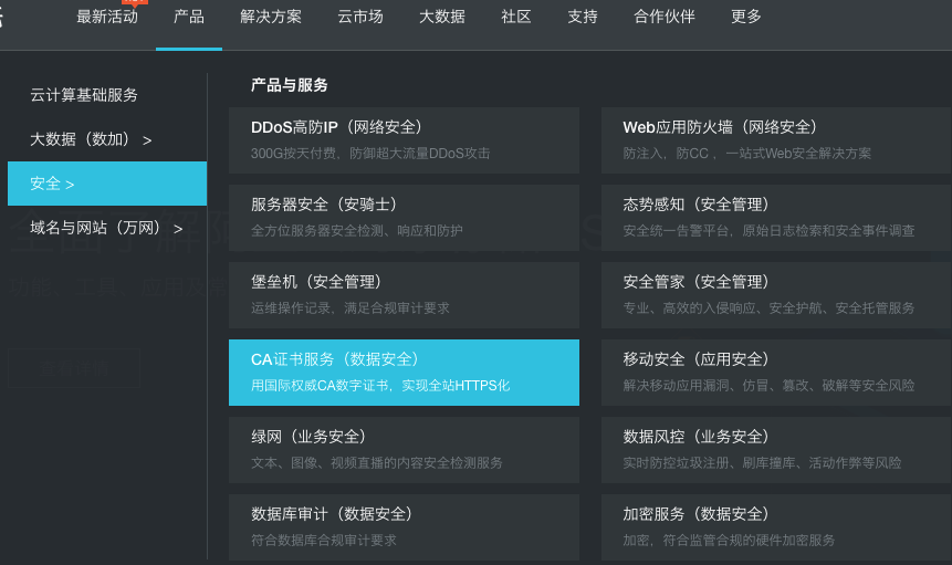 - 登录阿里云产品中心,选择安全 -> CA 证书