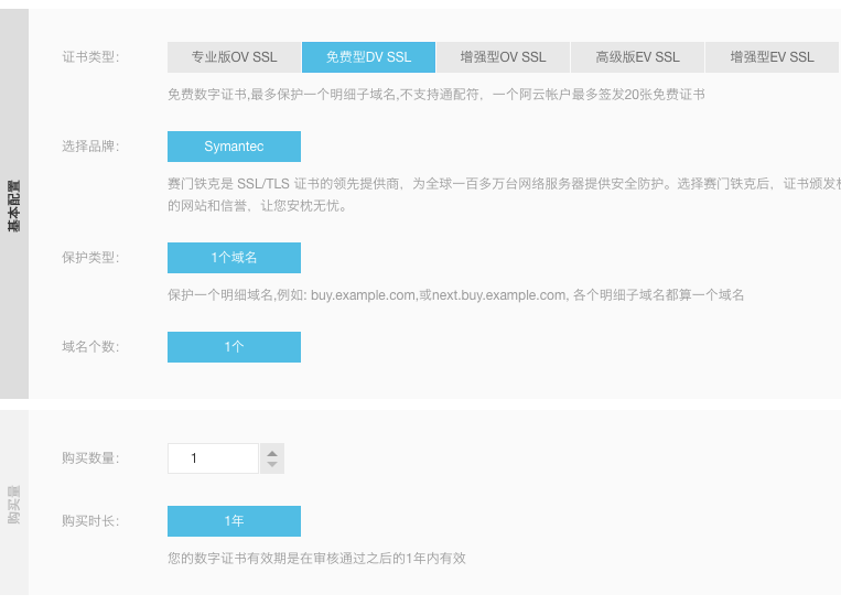 那么这里作者带领大家通过 CSR 的方式申请一个免费的 CA 证书,现在通过阿里云可以免费申请一个固定域名的 Symantec 的 CA 证书;