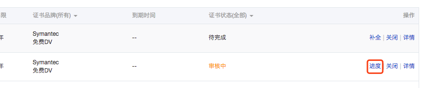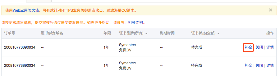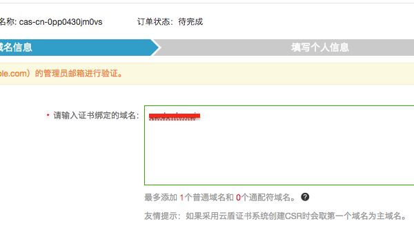 - 购买好了以后,进入管理后台管理,进入安全(云盾)-> 证书服务,然后对证书进行补全