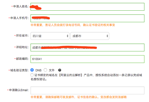 这里要强调的是,阿里云需要验证域名的归属,既验证该域名的确归你所有;可以通过 DNS 和 文件 的两种方式进行验证;这里呢,我选择的是通过 DNS 验证,验证的大致过程是,阿里会向你的申请邮箱中发送一份邮件,邮件的内容中包含了如何验证域名的方法,里面包含一条用于验证的 TXT 记录,这个需要到个人域名管理中心去配置 TXT 转发规则即可;