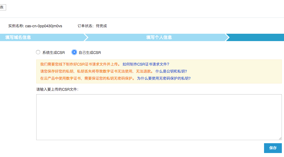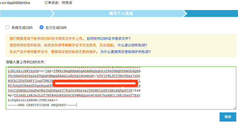 - 将上述内容复制,粘贴到阿里证书服务页面,点击保存