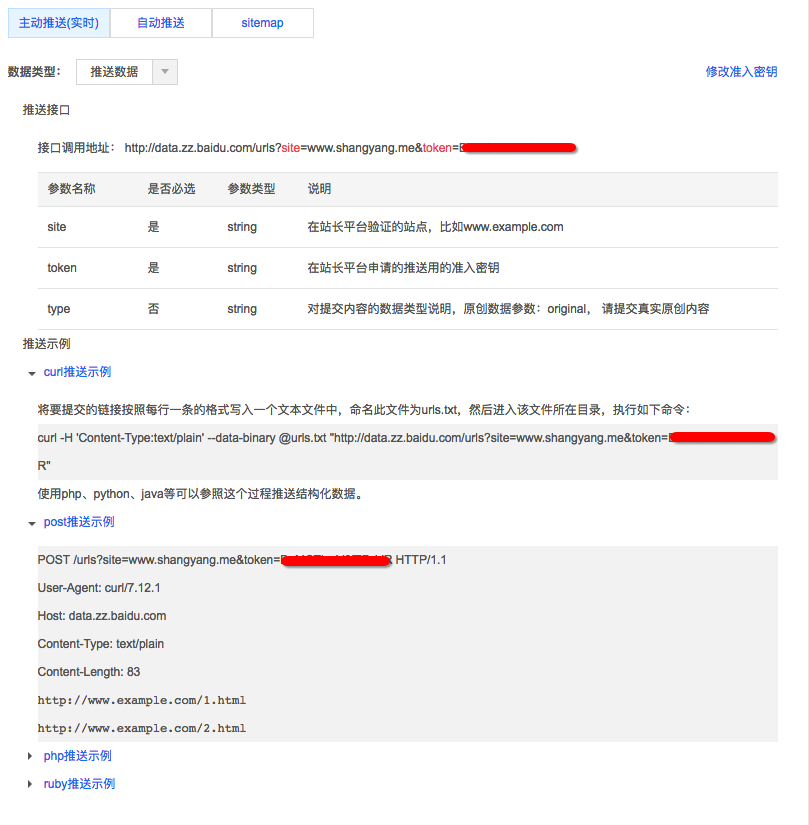 这部分内容可以参考让百度收录网站;登录你的站长平台 http://zhanzhang.baidu.com/linksubmit/index?site=http://www.shangyang.me/ 以后,进入网页抓取 -> 链接提交,可以看到,自动提交有三种方式,主动推送(实时),自动推送,以及 sitemap;自动推送就是在你的页面上添加百度搜索的 javascript 脚本,当页面每次被用户点击的时候,会将链接推送给百度;这里,由于自己的博客还没有被百度收录过,访问量不大,所以想让百度能够尽快的进行收录,最快捷的方式就是采用主动推送(实时)的方式;给一张相关截图如下,