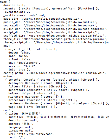 里面包含了所有 hexo 环境相关的参数;比如,下面是执行命令hexo server --draft