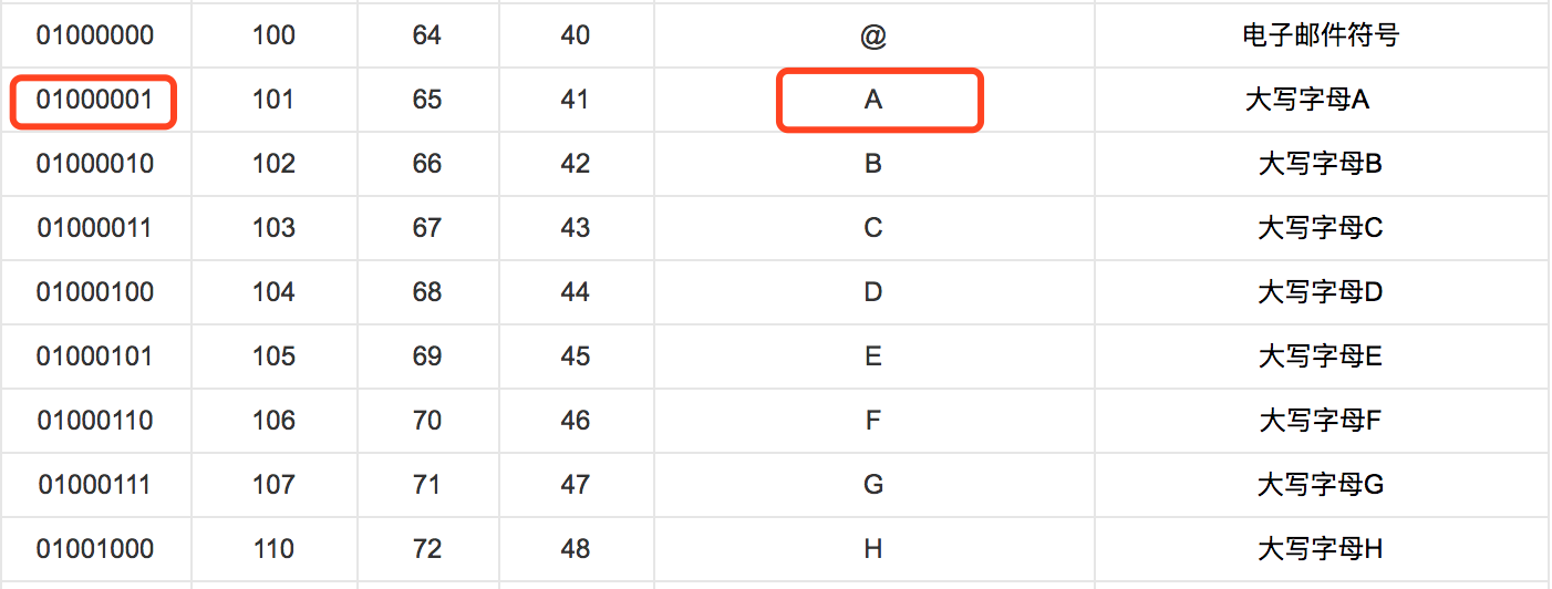 的时候,它就会通过 ASCII 码表进行映射,得到人类可以识别的符号,既是字母A