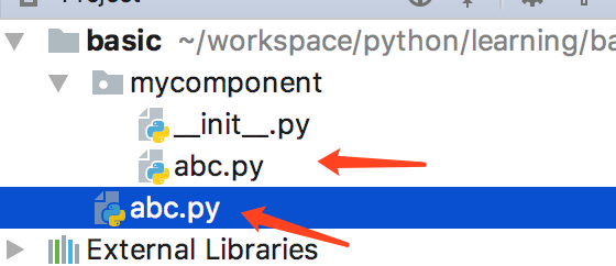 为了避免同名模块之间的冲突,Python 中也引入了包的概念;如图,我们有两个同名的模块abc