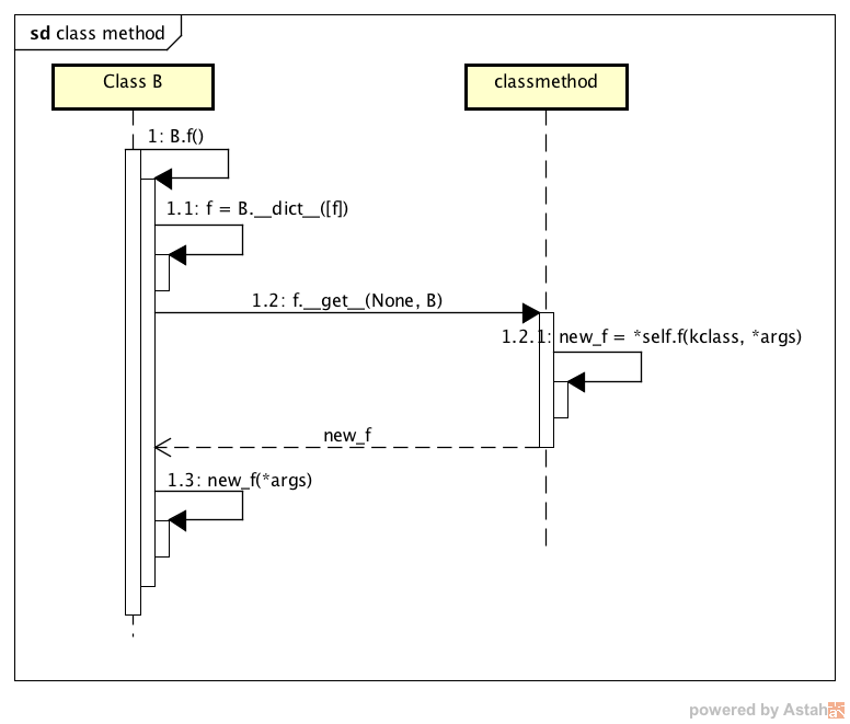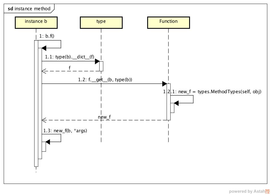 参数;最后通过方法 $types.MethodType(self, obj)$ 构造出一个实例方法 $new\_f$ 的引用并返回,因此,这里的参数 $self$ 指的是 $Function$ 实例本身,而参数 $obj$ 是实例 $b$; - 最后调用 $new\_f(b, *args)$ 以完成该实例方法的调用;