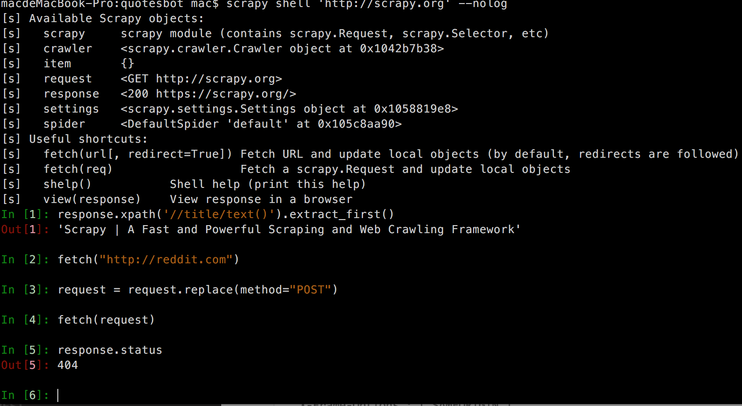 下面我们通过一个典型的例子来了解一下 Scrapy Shell 的会话过程,首先,爬取 http://scrapy.org 页面,然后再切换至爬取 https://reddit.com 页面,过程中,我们通过修改 (Reddit) 请求方法为 POST 请求,最终 fetch() 的时候得到一个 404 的错误;记住,这个例子中所爬取的页面是随着网站的变化随时有可能变化的;