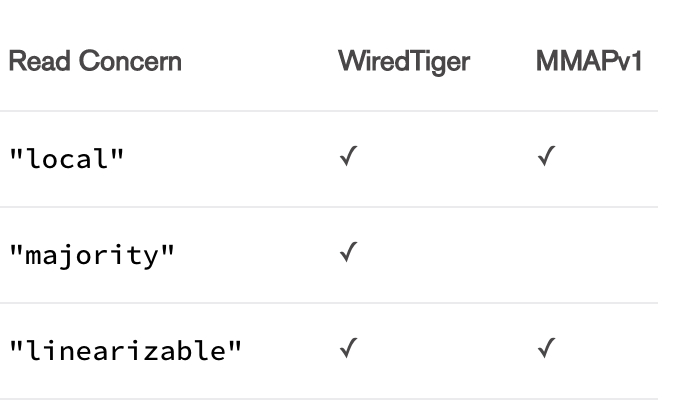1 | readConcern: { level: <"majority"|"local"|"linearizable"> } |