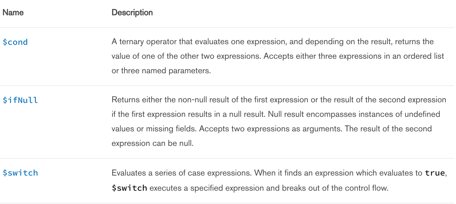 1 | { $cond: { if: <boolean-expression>, then: <true-case>, else: <false-case-> } } |