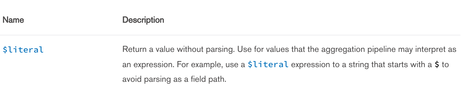 \$literal,它的功能实际上是充当的是一个转移符的功能;可以将 \$ 转移为一个普通字符;由 field paths and system variables 中可以知道,在表达式中,我们通过使用 “$<field>>” 的方式来引用某一个字段的值,但是有时候,当使用 \$ 的时候,并不是想引用该字段的值,而是因为我们想使用一个包含 $ 字符的字符串来进行匹配而已;所以,这里可以看做是,通过 \$literals 达到对 \$ 进行转移的效果;具体参考例子将 $ 进行转义;