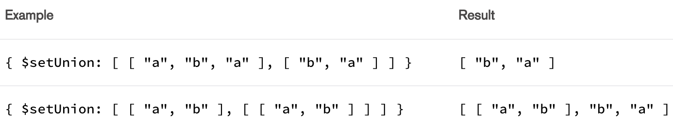 If the set operation returns a set, the operation filters out duplicates in the result to output an array that contains only unique entries. The order of the elements in the output array is unspecified.