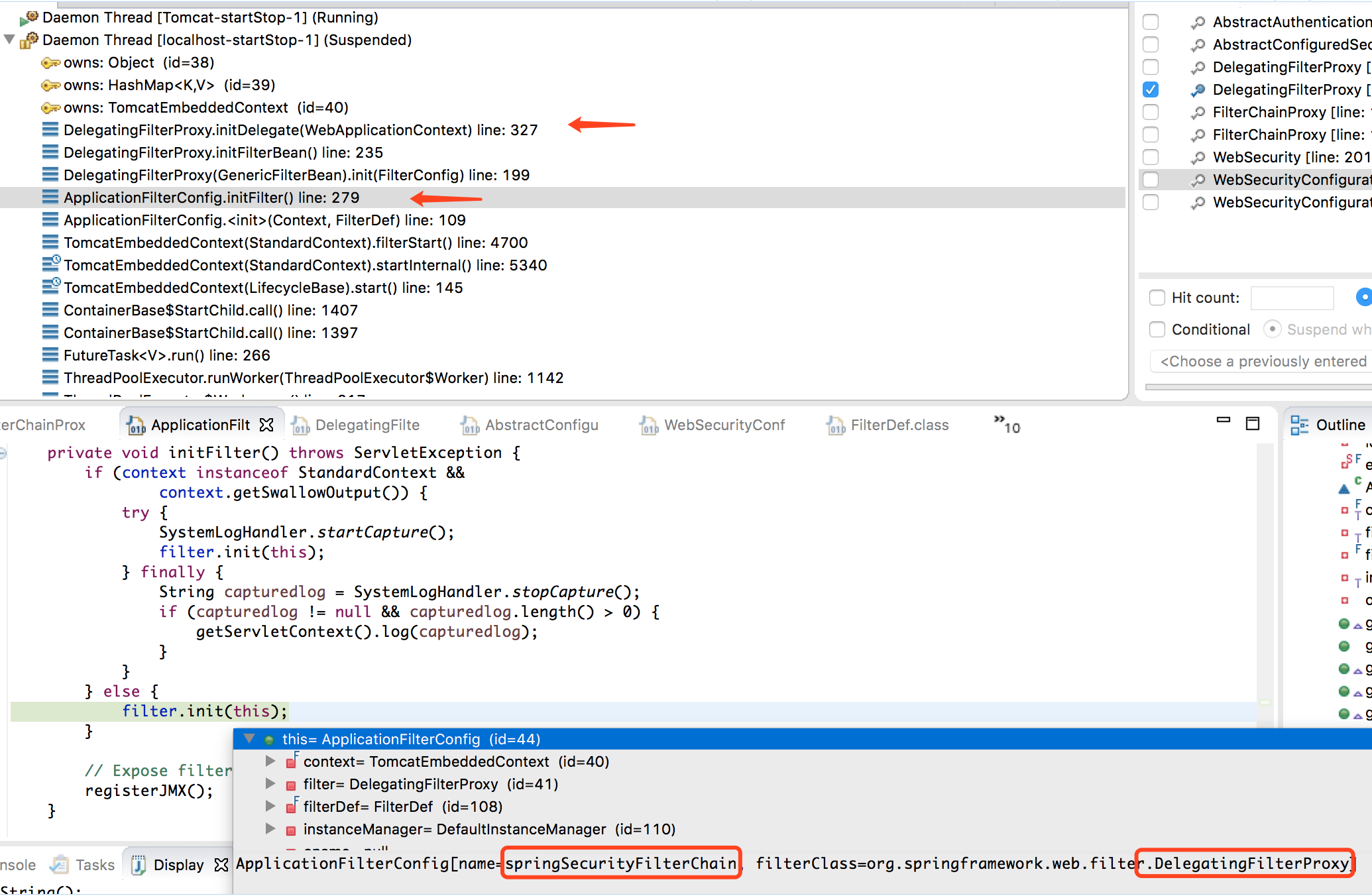 在分析 DelegatingFilterProxy 初始化过程中的时候,当调试到其初始化的配置相关内容的时候,比如这里有关 DelegatingFilterProxy 所相关的 ApplicationFilterConfig 的时候,可以看到 [name = springSecurityFilterChain, filterClass=org.springframework.web.filter.DelegatingFilterProxy] 所以也就频频让我误认为 “springSecurityFilterChain” 所对应的正是 DelegatingFilterProxy Spring Bean 对象;