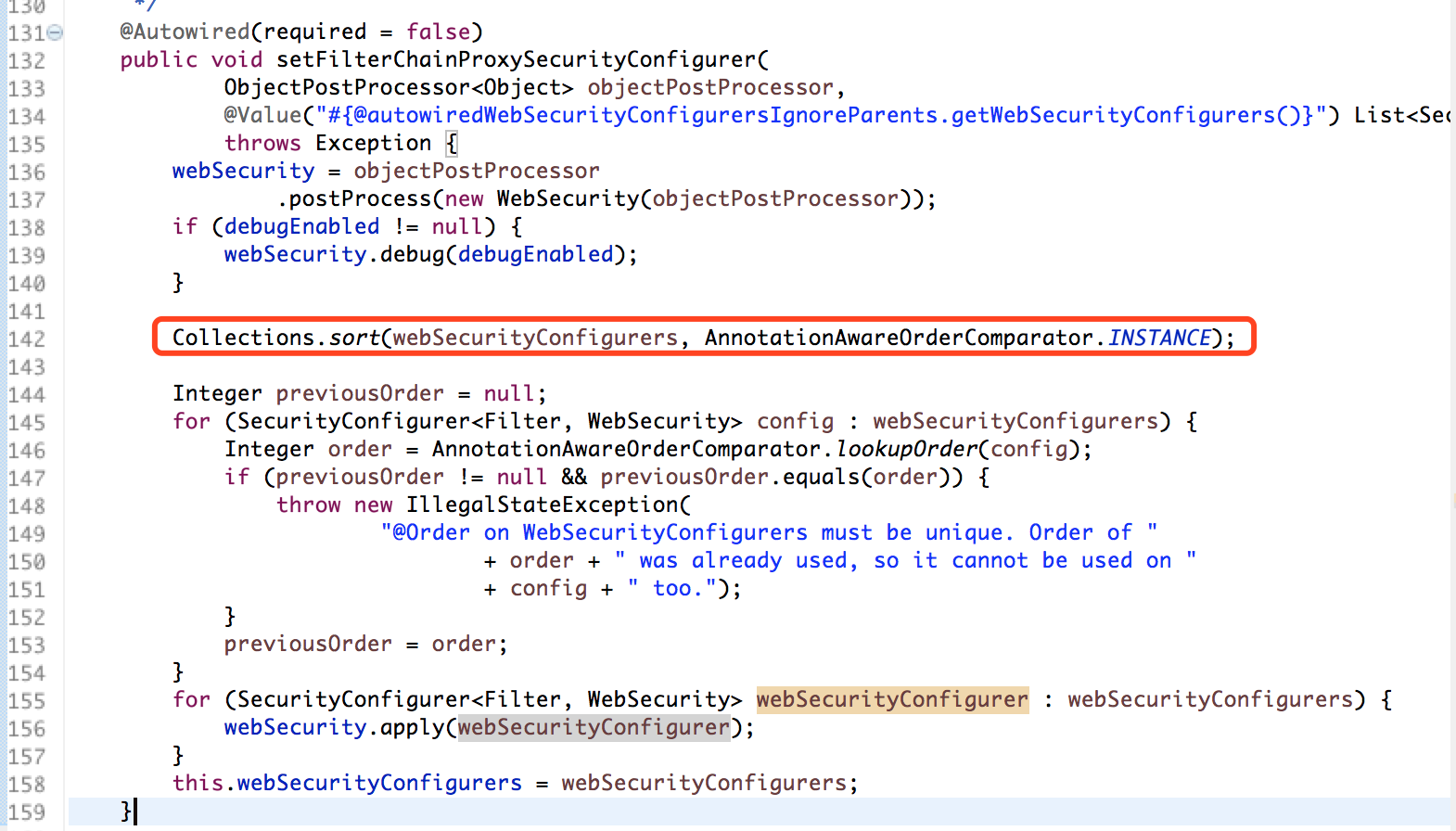 代码第 142 行,就是根据 @Order 对 SecurityFilterChain 进行排序操作;
