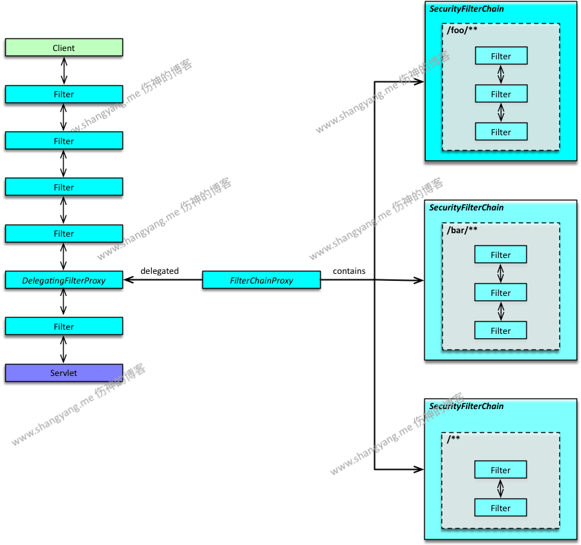 如图,当客户端发起一个 /foo/** 的请求,首先会经过 Servlet Filter 逻辑将请求转发至DelegatingFilterProxy