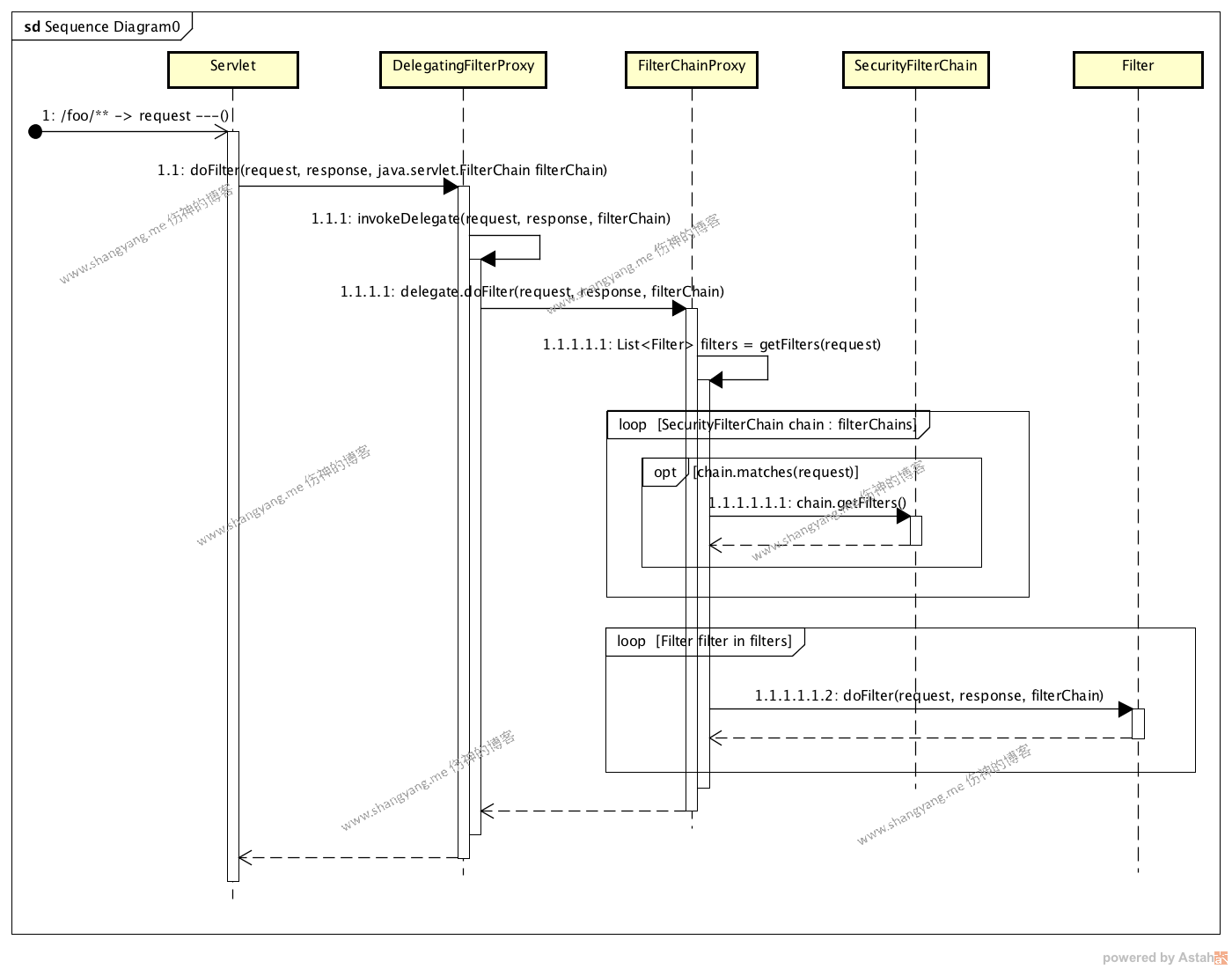 通过上述的方式所生成的 SecurityFilterChain 实例将会自动的注册到 FilterChainProxy 对象中,并处理 URL 链接匹配 /foo/** 的访问;