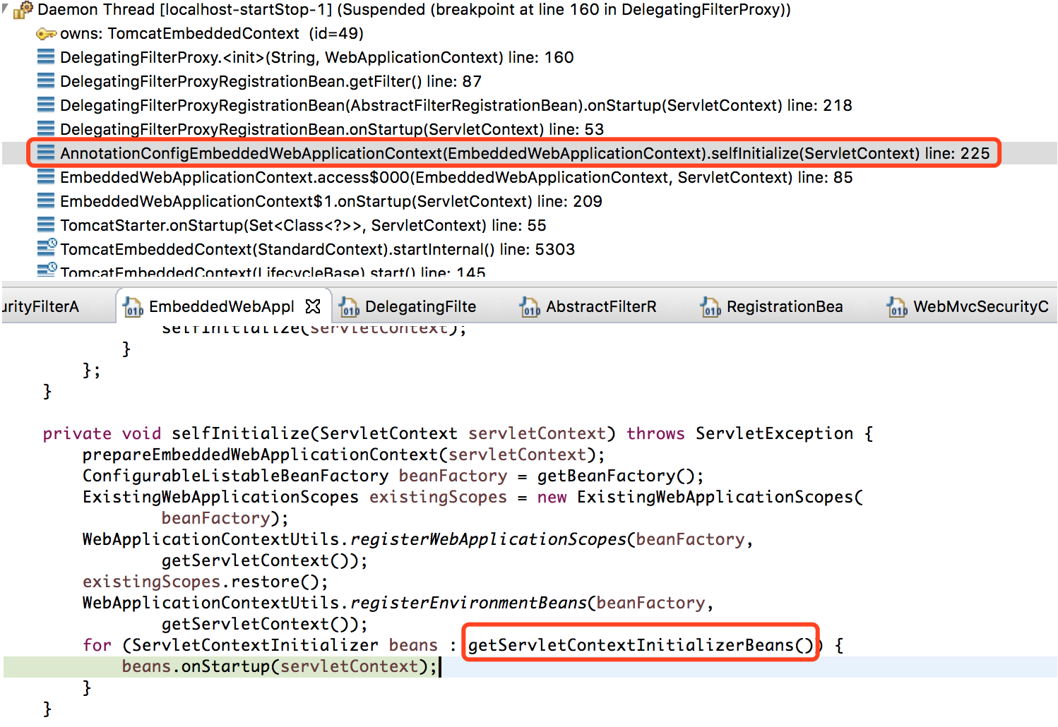 如图所示,Spring Boot 使用的是 TomcatEmbeddedContext 的方式来加载的 Filters,所以和 Spring MVC 通过使用 AbstractSecurityWebApplicationInitializer 来加载 Filter 的方式不同,下面我们就这种方式来进行分析,看看是如何通过 TomcatEmbeddedContext 一步一步的来加载 Filters 的?