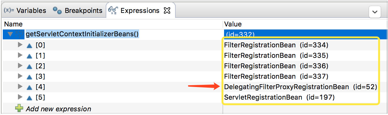 从上述的第 #1 点可以知道,通过从容器中查找类型为 ServletContextInitializer 的 bean,既可以找到 DelegatingFilterProxyRegistrationBean 和其余 5 大 Filters;那么问题是,这些 Filters 是如何提前被注入到 Spring 容器中的呢?