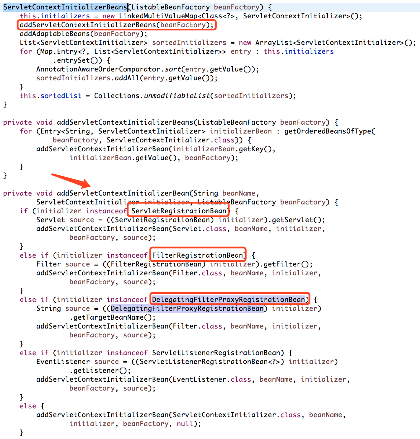 和其余 5 大 Filters 均实现了该接口;所以,DelegatingFilterProxyRegistrationBean 以及其余 Filters 将会在这里被取出;addServletContextInitializerBean(String beanName, ServletContextInitializer initializer, ListableBeanFactory beanFactory)