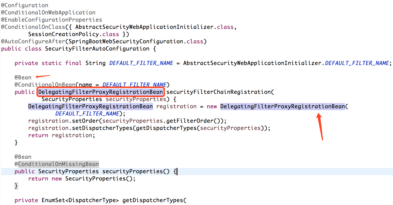做为 Filter 被注入到 Spring 容器中的逻辑,看一下 org.springframework.boot.autoconfigure.security.SecurityFilterAutoConfiguration 类的逻辑