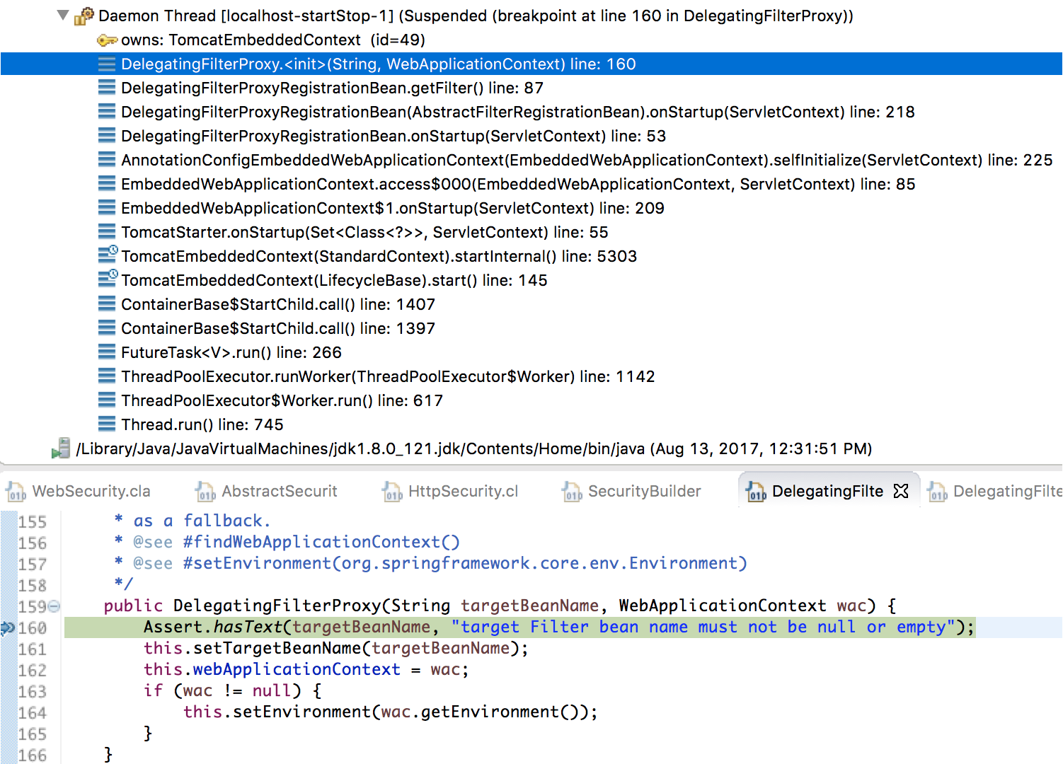 首先,将断点打在 DelegatingFilterProxy(String targetBeanName, WebApplicationContext wac) 中,我们将会得到如下的调试状态,