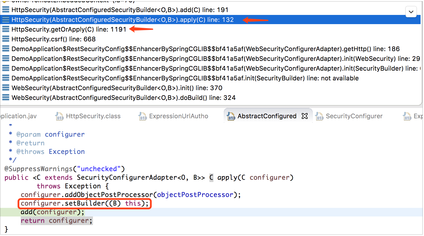 ,正是因为在 apply 的过程中,将当前的 builder 既 HttpSecurity 对象注入到了 configurer 中,所以,可以通过任意的一个 configurer 对象通过调用其 and() 方法都可以获取到当前的 HttpSecurity 对象;就类似于在配置过程中通过 http.csrf().and() 既可以获取得到 HttpSecurity 对象;