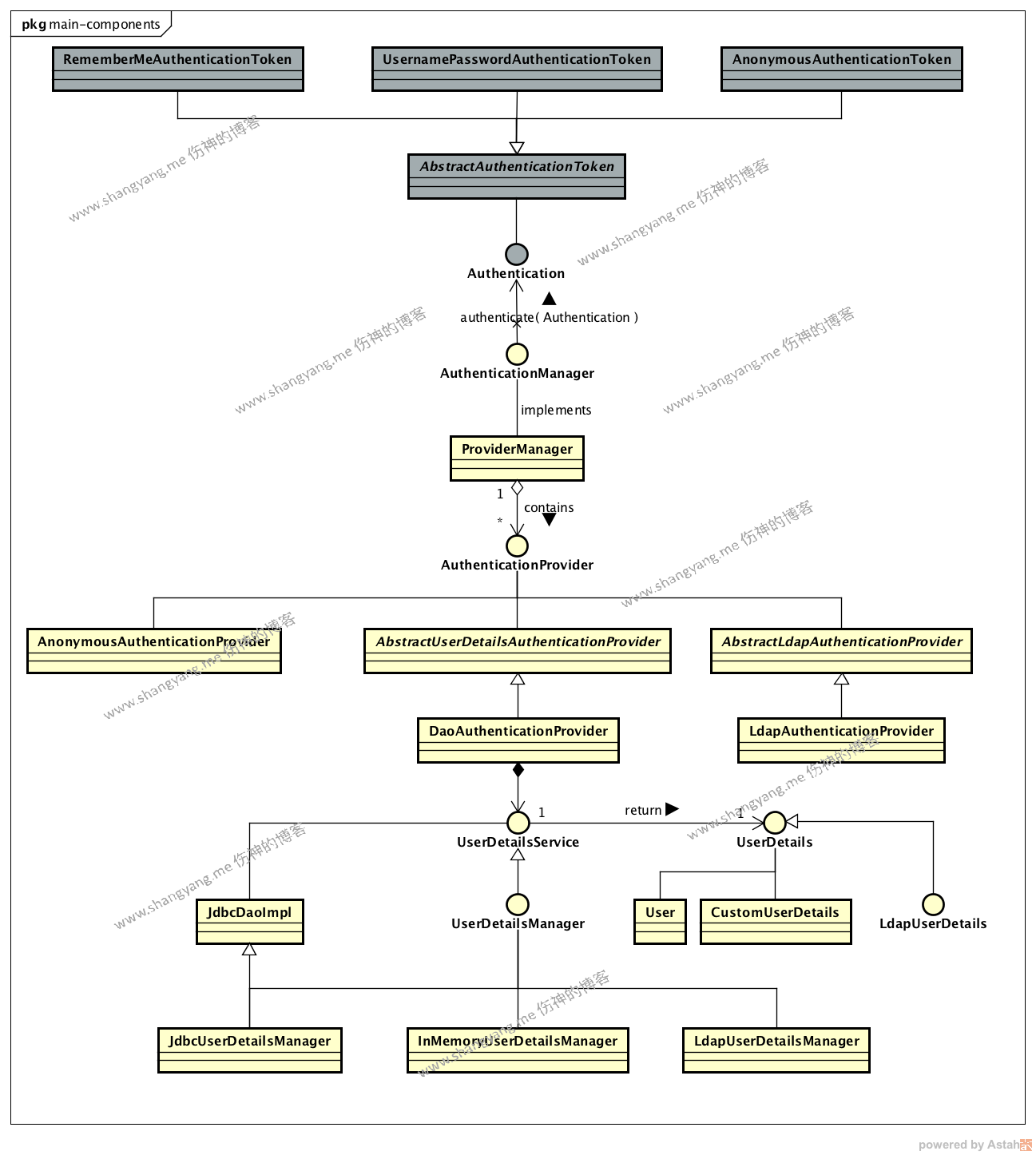从回顾中可以看到,DaoAuthenticationProvider 与 UserDetailsService 是包含关系,既是 UserDetailsService 对象是 DaoAuthenticationProvider 的一个属性;UserDetailsService 由 UserDetailsManager 接口实现,其实现类可以是 InMemoryUserDetailsManagerConfigurer 或者是 JdbcUserDetailsManagerConfigurer;