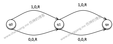 上述一进制加法的图灵机对应的有限状态机,如下图所示,